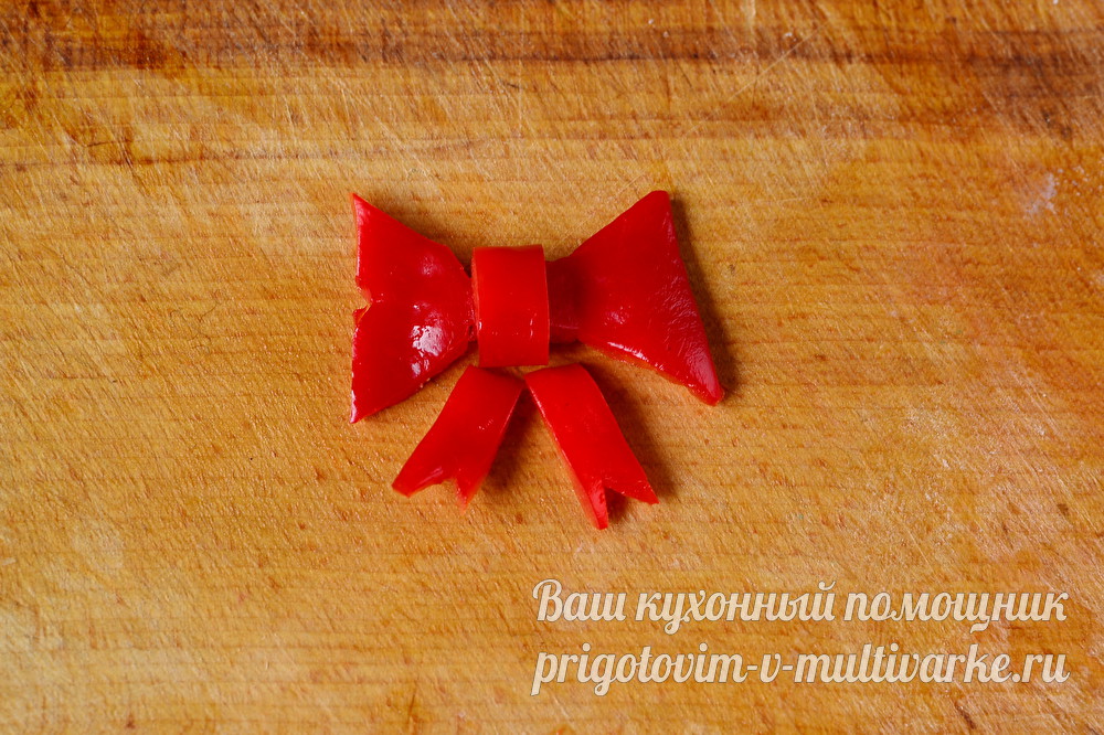 В нижней части прикрепляем бант из перца. Так же зелень раскладываем между сосисками. Подаем закуску с соусом барбекю.