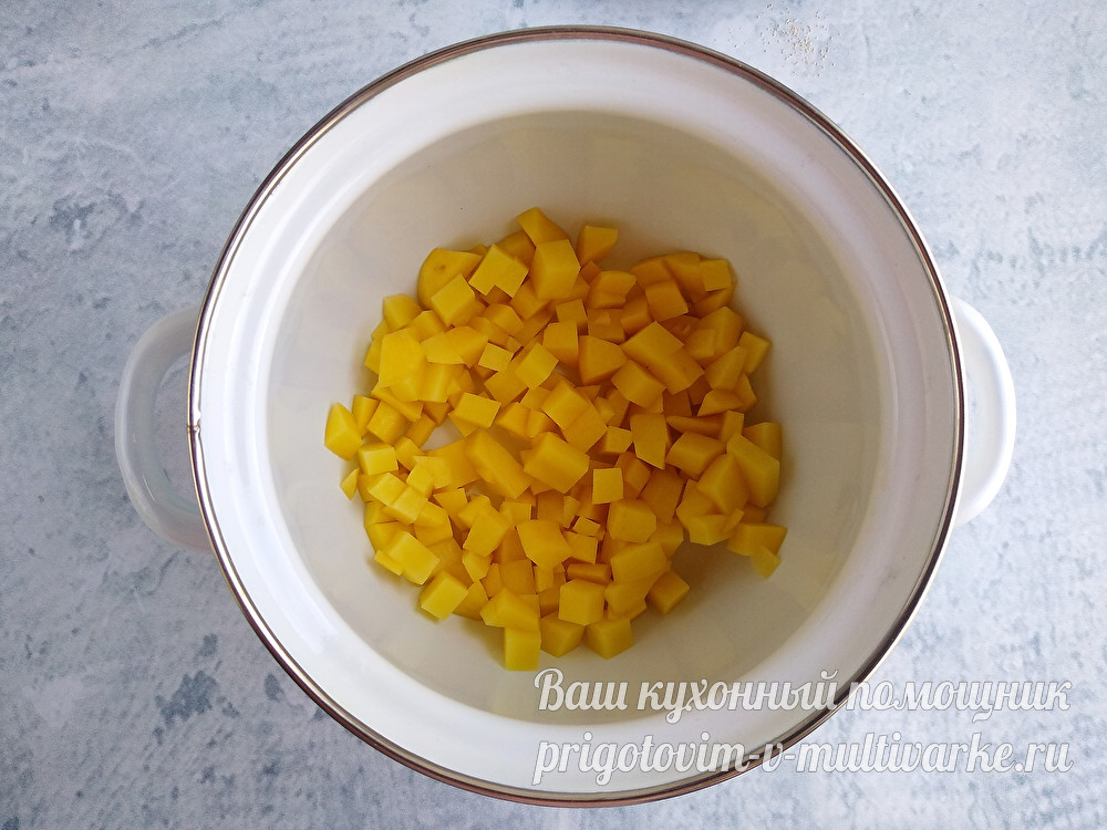 Картофель очистить от кожуры и нарезать небольшими кубиками. Промыть от излишков крахмала, выложить в кастрюлю и залить водой. Отварить до готовности, воду слить.