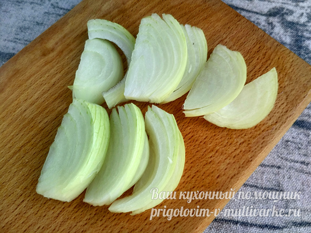 Лук очистить и нарезать крупными перьями.