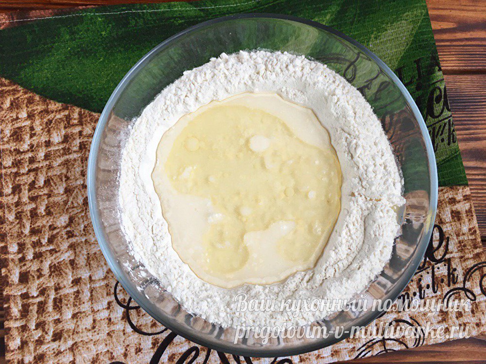 В эту лунку вливаем простоквашу, растительное масло, воду. Туда же добавляем соль, сахар и соду. Постепенно захватывая с краев муку, замешиваем сперва жидкое тесто. Когда вся мука войдет в тесто, перемещаем его в рабочую поверхность.