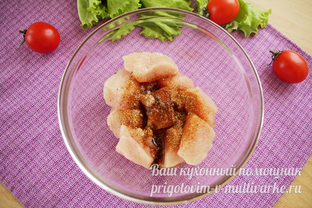 Добавляем к мясу 2 ч.л. специй для шашлыка, соль, 2 ч.л. соевого соуса.