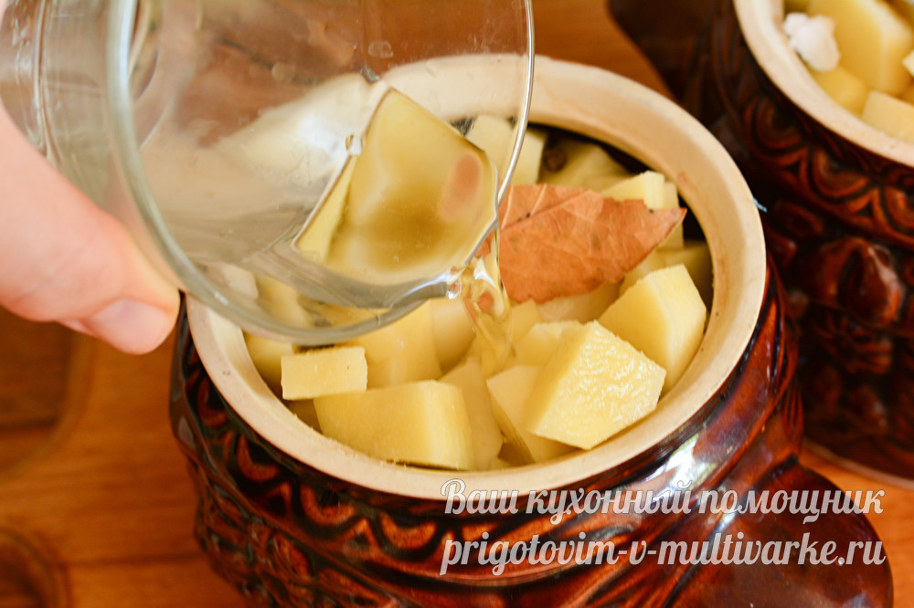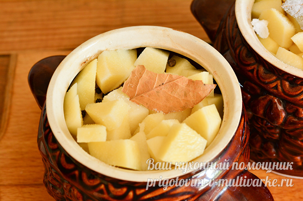 Затем выложите картофель. Завершающими ингредиентами у вас должны быть специи: перец горошком и лавровый лист. Какое количество добавлять, решать вам. Я всегда кладу на один горшочек штук 5 перца горошком и 1 небольшой лавровый листик.