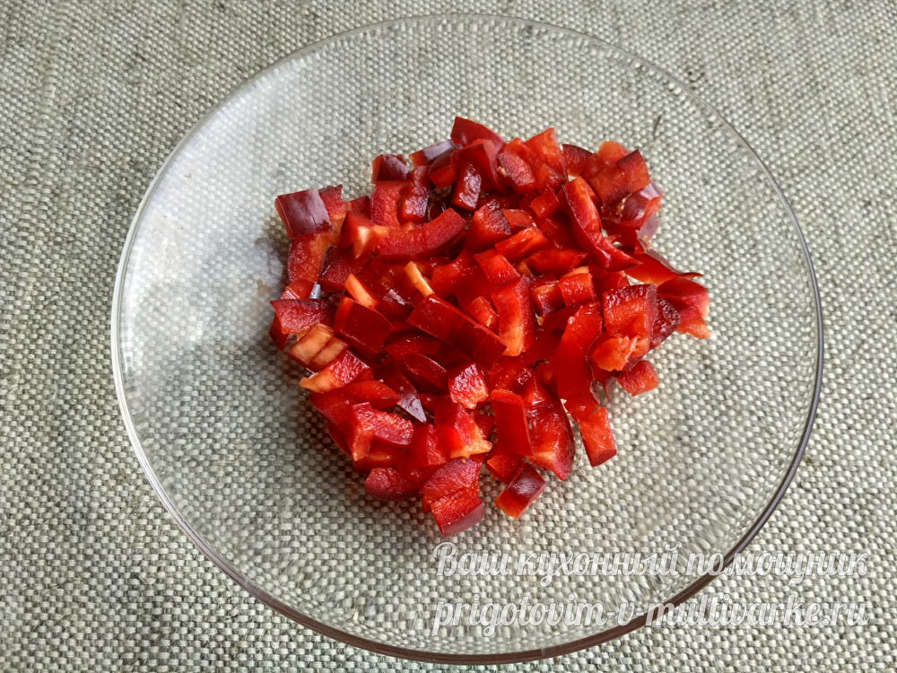Сладкий перец очистить от косточек и перегородок и измельчить аналогично.