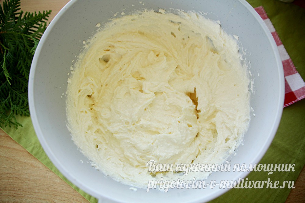 Дно и бока чаши мультиварки смазываем сливочным маслом. Выкладываем в чашу мультиварки творожную массу, верх разравниваем ложкой.