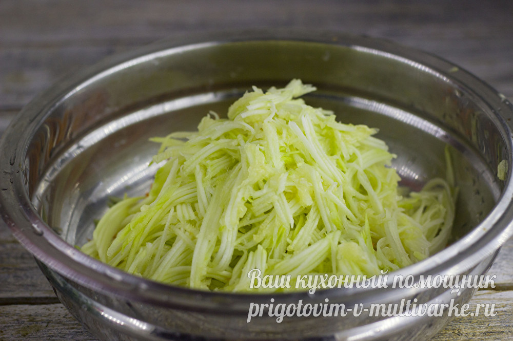 Кабачки заранее вымочили в холодной воде, затем очистили от кожуры, вырезали семена. Натираем кабачки на такой же терке, как и морковку. Выложили кабачковую стружку к морковке. Если у овоща шкурка мягкая, то ее можно не срезать.